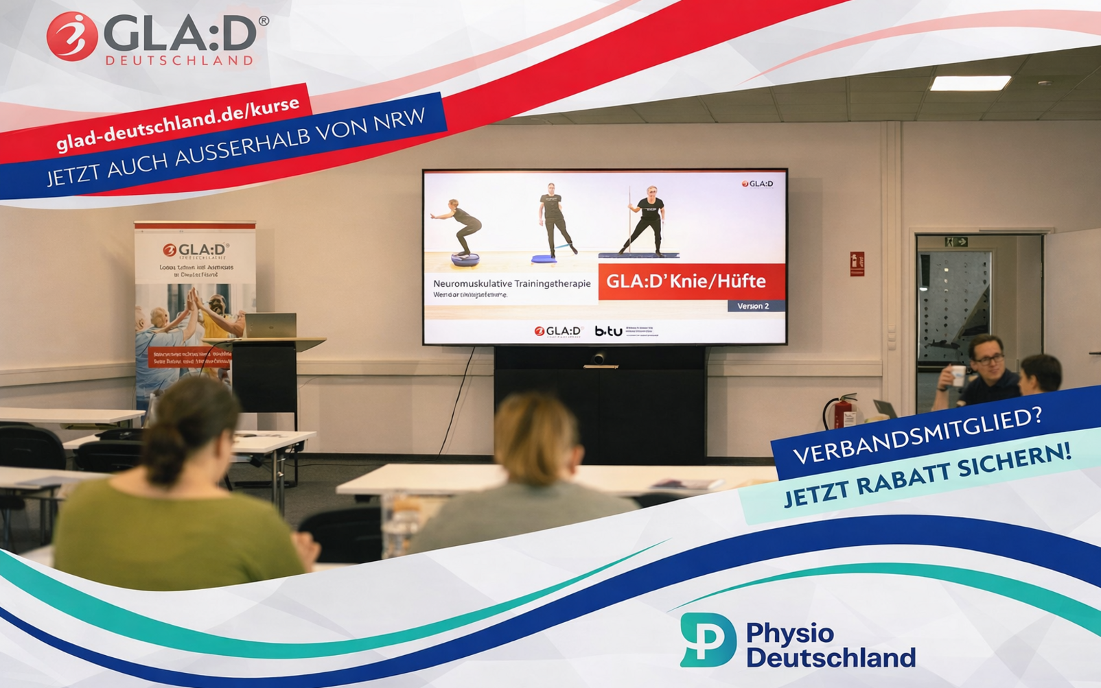 In Kooperation mit Physio Deutschland finden 2026 Therapeut*innen-Schulungen auch außerhalb von Essen statt – nämlich im März in Ulm und im Mai in München. Weitere in der zweiten Jahreshälfte sind bereits in Planung. Mitglieder von Physio Deutschland können vergünstigt die GLA:D-Schulung besuchen. Den Rabattcode finden Mitglieder nach dem Login hier.