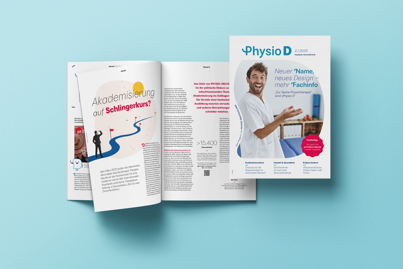 Dem neuen Namen und dem modernen Design ist Ende 2022 eine Mitgliederbefragung vorausgegangen. Die Ergebnisse sind in die Entwicklungen eingeflossen. Denn: Beteiligung und kollegialer Austausch ist ein wesentlicher Bestandteil der Verbandsphilosophie von PHYSIO-DEUTSCHLAND. Die Redaktionsgemeinschaft freut sich auf Rückmeldungen, Themenwünsche und weitere Anregungen. Aufbau und Layout von Physio D haben wir gemeinsam mit der Grafikagentur Tack Design erarbeitet. Der Dank der Projektgruppe geht hier an Michael König, den Kreativdirektor und Geschäftsführer der Berliner Agentur.